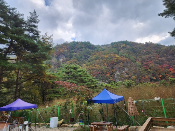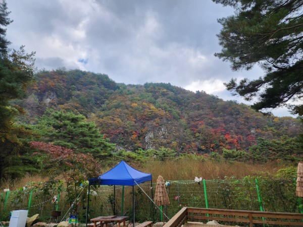 캠핑장에서 바라보는 절벽에 형성된 오색 울긋불긋 단풍들이 예뻐서 사진 올려봅니다 ㅠㅠ